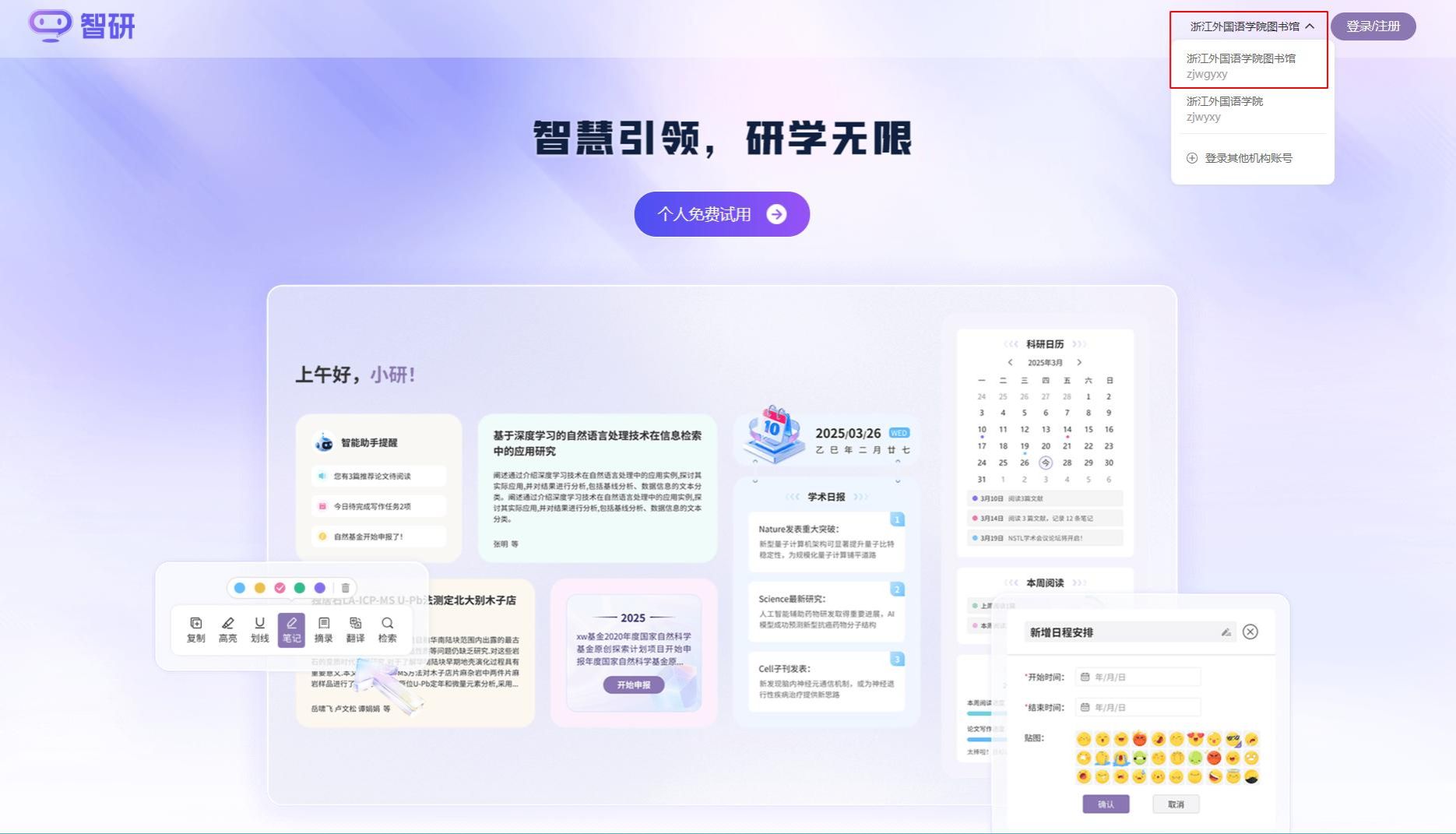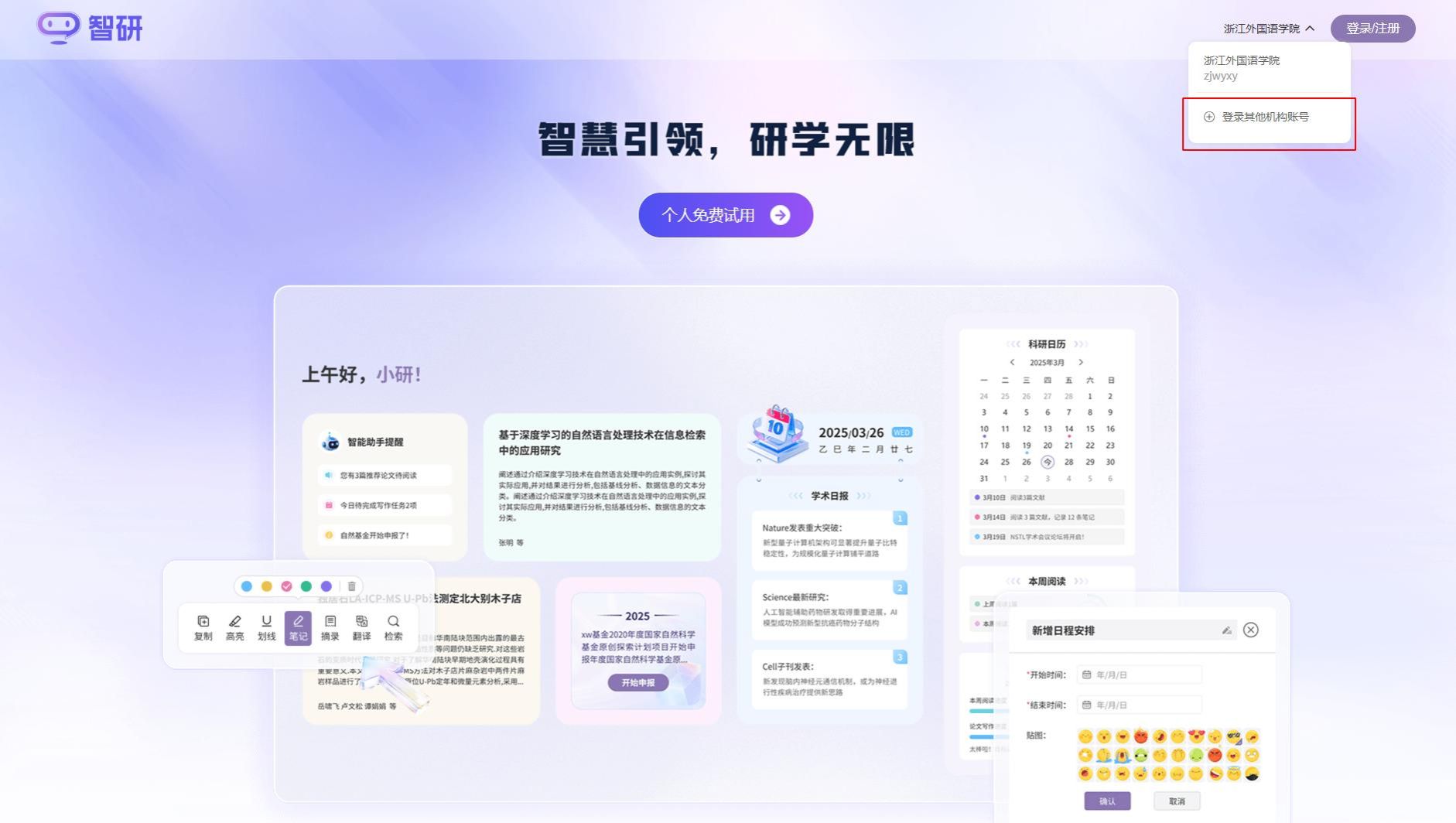 万方数据智慧研究服务平台(简称智研平台)针对科研学者、学生、老师等用户群体的研究学习场景,提供集“搜、读、写、研”为一体的智慧研究服务,贯穿科研学习全流程。智研平台结合万方自有海量资源,打通与主站文献的关联,支持在智研中对主站文献添加收藏、订阅、笔记等操作,助力高效管理文献;辅助科研选题,分析热点与难题;智能论文写作、选题推荐、大纲编写、文本润色,提高创作效率,智能推荐学术期刊,帮助精准投稿;学习目标和任务个性化制定和提醒、重要事项记录等,轻松掌控科研学习全流程。